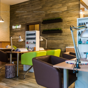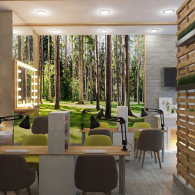 The atmospheric interior of the studio will impress even the most sophisticated clients. One of the walls of the salon is made in the form of a large panel depicting a forest, which creates the effect of freshness and tranquility.