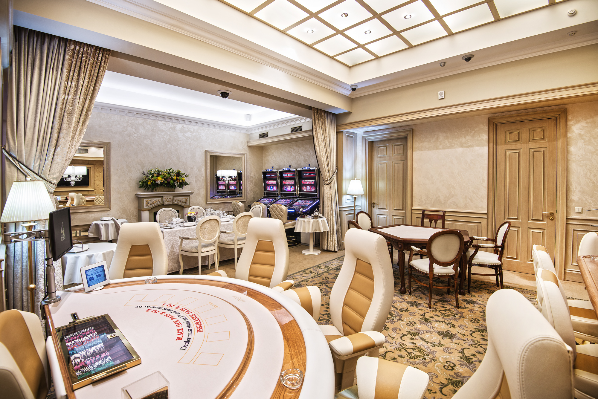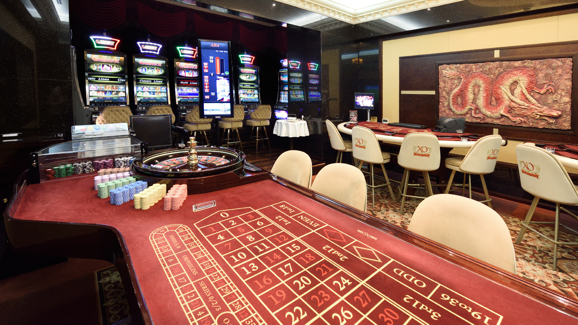 The casino offers 4 exclusive rooms with their own special atmosphere. Here you will feel a special atmosphere of elegance, where glossy glass glamor is replaced by antique and oriental themes, which gives an exclusivity to the establishment.