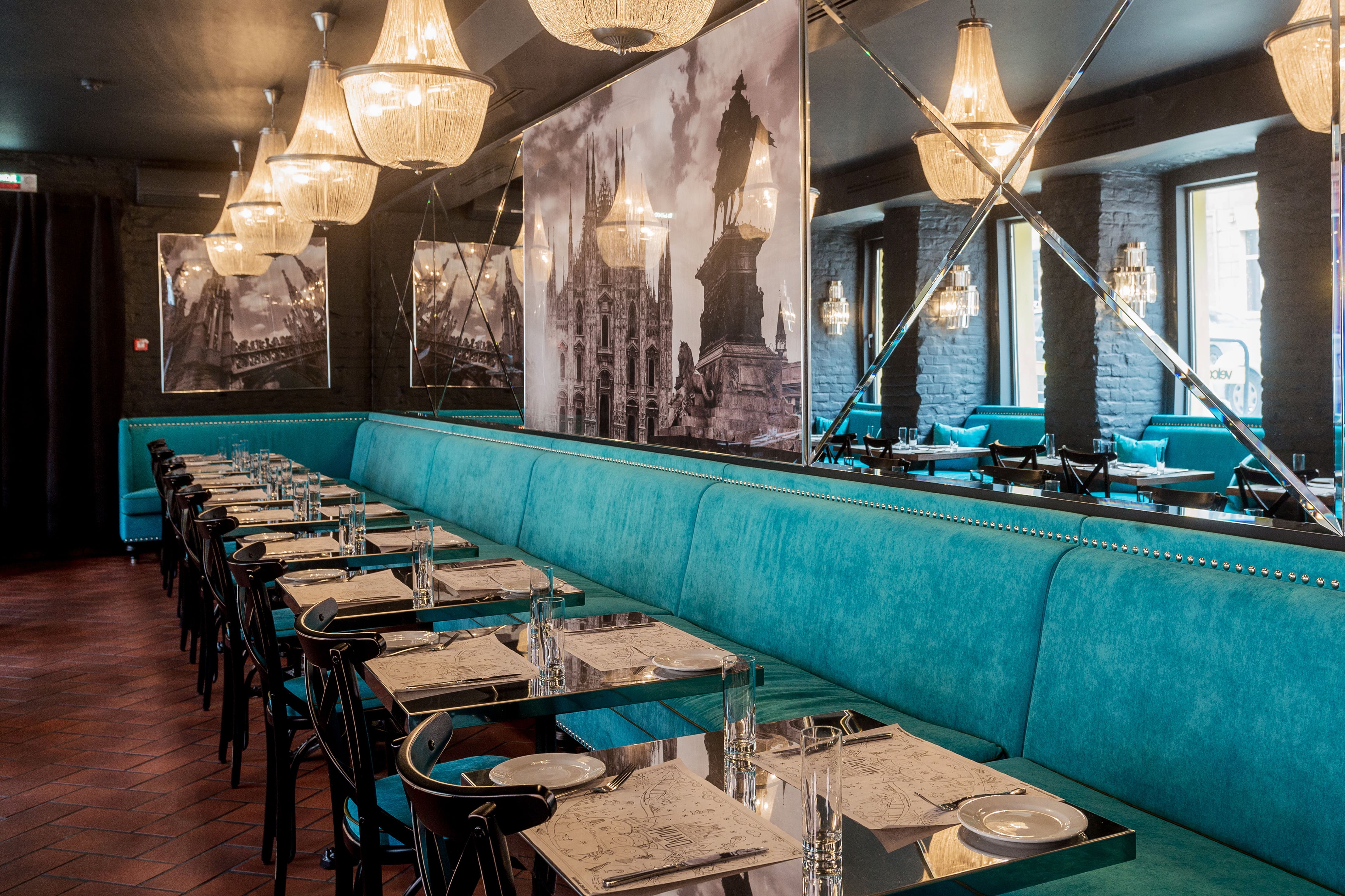 At 19 Volodarskogo Street in Misnk, an atmospheric establishment «Milano-Café» is presented. This is an atmospheric interior with a non-trivial color palette and delicious cuisine from a talented and ambitious chef. The interior of Milano Café is decorated in a modern style. The laconic design is emphasized by the upholstery of the sofas in tiffany color in combination with the «silver» countertops and bar. Black-and-white photographs of Milan's landmarks add coziness to the atmosphere of the establishment. Summer terrace «Milano-Café» is located along the sidewalk at the intersection of Marx and Volodarsky streets. The terrace is designed in European style with an emphasis on rattan furniture.