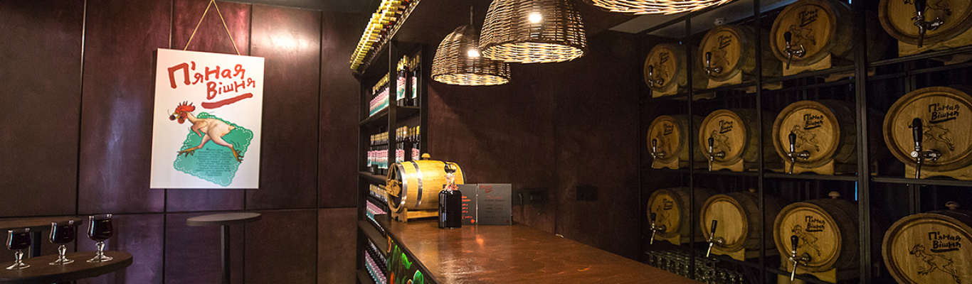 По адресу улица Зыбицкая, дом 9 в Минске стоит интересное свои форматом заведение - монобар «Пьяная вишня». Это значит, что в баре продается только один напиток. Нет ни коктейлей, ни горячих или холодных закусок, только один напиток и все. Создатели бара уверяют, что рецептура предлагаемого напитка в прошлом повсеместно распространен на территории Беларуси, а особенно — на Полесье. Стульев в заведении нет, что предполагает быстрое утоление жажды и смену посетителей, то есть они здесь не задерживаются. Этикетку для монопродукта разработал известный белорусский дизайнер Владимир Цеслер. На ней изображен петух — голый и с вишней в клюве. Стены задекорированы картинами в стиле этикетки напитка.